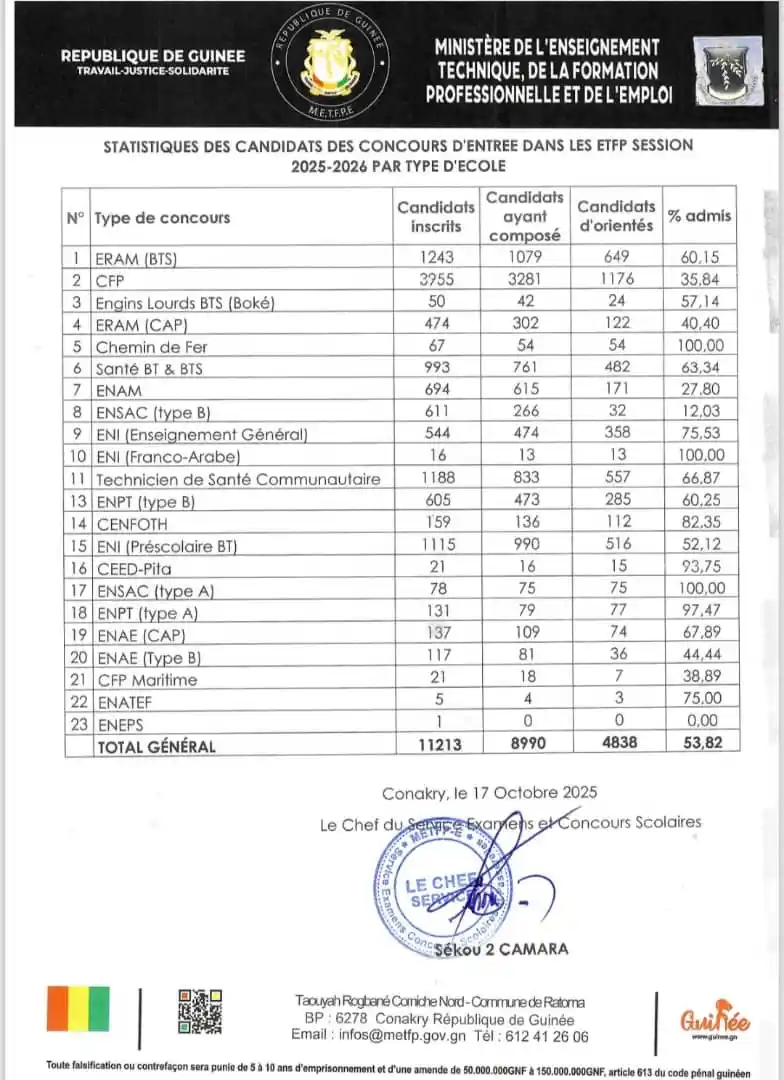 Résultats des concours d'accès 2025-2026 : ENAM, ENAE, CENFOTH, ENSAC, ERAM, CFP (MATOTO, BEYLA, BOKE, LABE, FARANAH, FRIA, KINDIA, NZEREKORE) et ENI